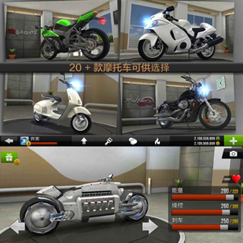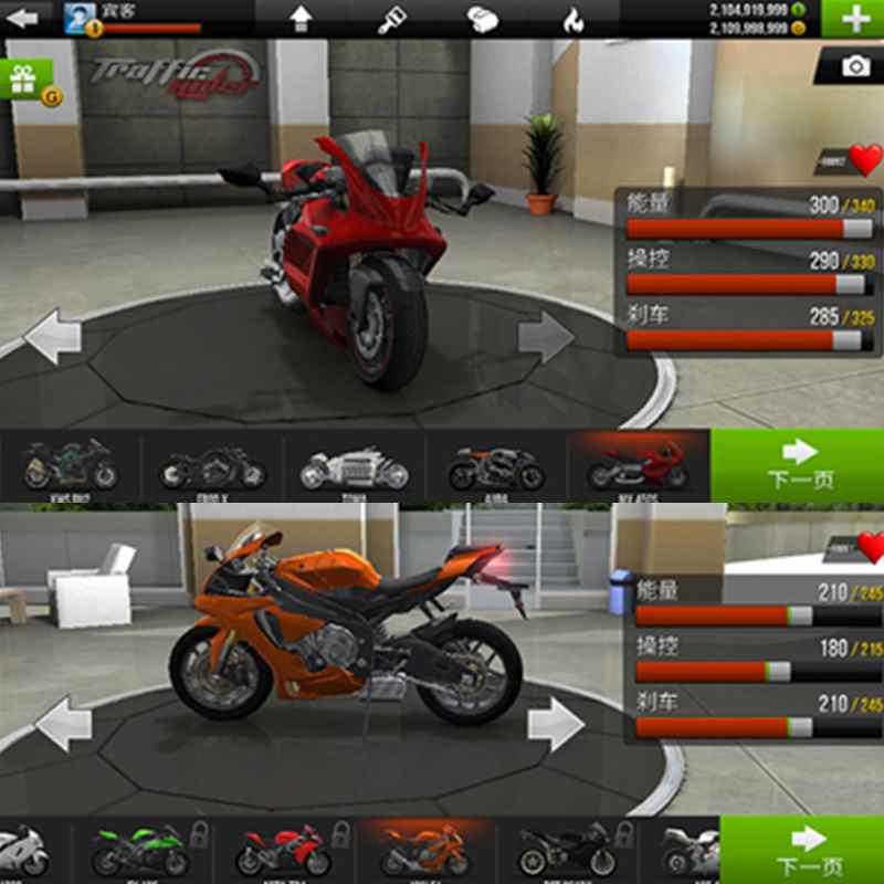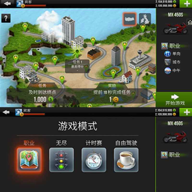 公路骑手 是一款非常好玩刺激的3D赛车模拟手游,采用了3D物理引擎制作,画质十分的精美逼真,由远及近的景物层次感,路过车辆的呼啸声、加速引擎的马达声等,都为玩家带来了最为真实的赛车体验感。游戏里面的摩托车型也非常的丰富,从小绵羊到重型机车应有尽有,大家可以选择其中喜欢的一款进行游戏冒险。游戏玩法也十分的有趣,主要提供了四种模式,分别是职业生涯、无尽模式、计时赛、自由驾驶,在挑战途中玩家可以通过赢得比赛或完成各种任务获得金币,利用金币解锁升级更多高性能的机车,不断打破最高记录,登顶世界骑手排行榜。(无限金币、钻石,进入游戏即可获取,之后点击左下角设置里一直点击国旗即可切换为中文)