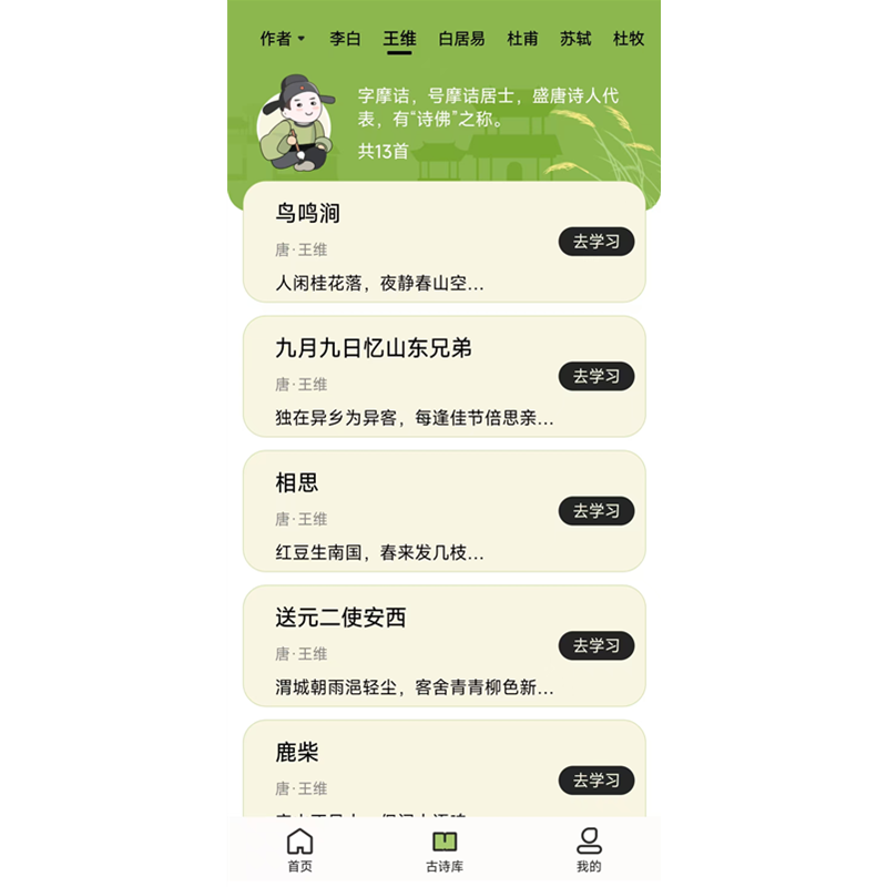 小学古诗大全 是一款小学一至六年级的古诗软件,软件提供翻译、注释、赏析及作者简介,功能包含古诗译文、注释解析、快速阅读训练、默写打分等模块。